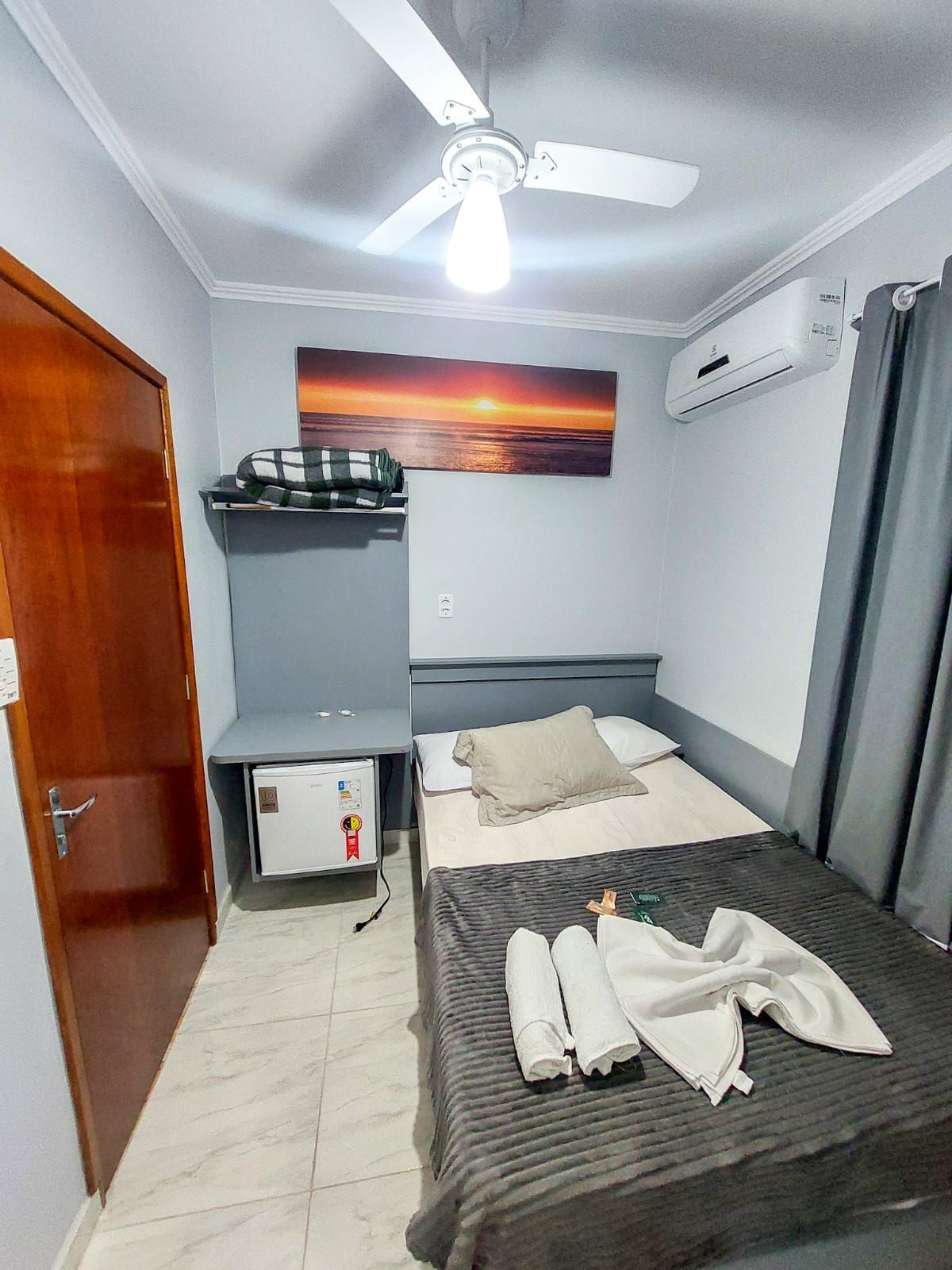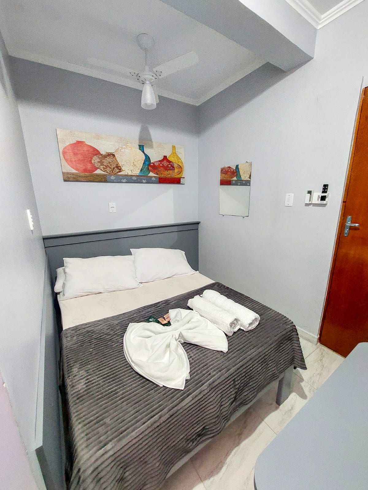 O quarto casal da Pousada Parada da Fé oferece um ambiente aconchegante e confortável, ideal para casais que buscam tranquilidade e privacidade. Equipado com cama de casal, ar-condicionado, TV, frigobar e banheiro privativo, o espaço garante uma estadia relaxante. A decoração simples e acolhedora cria uma atmosfera perfeita para descansar e aproveitar momentos de lazer em Aparecida, SP.