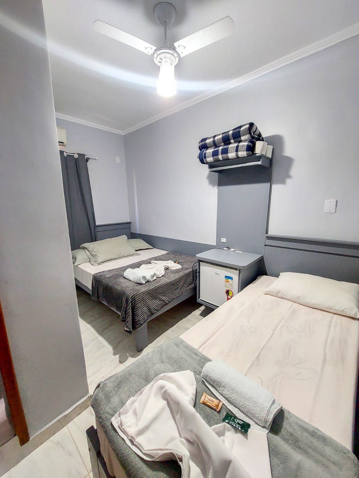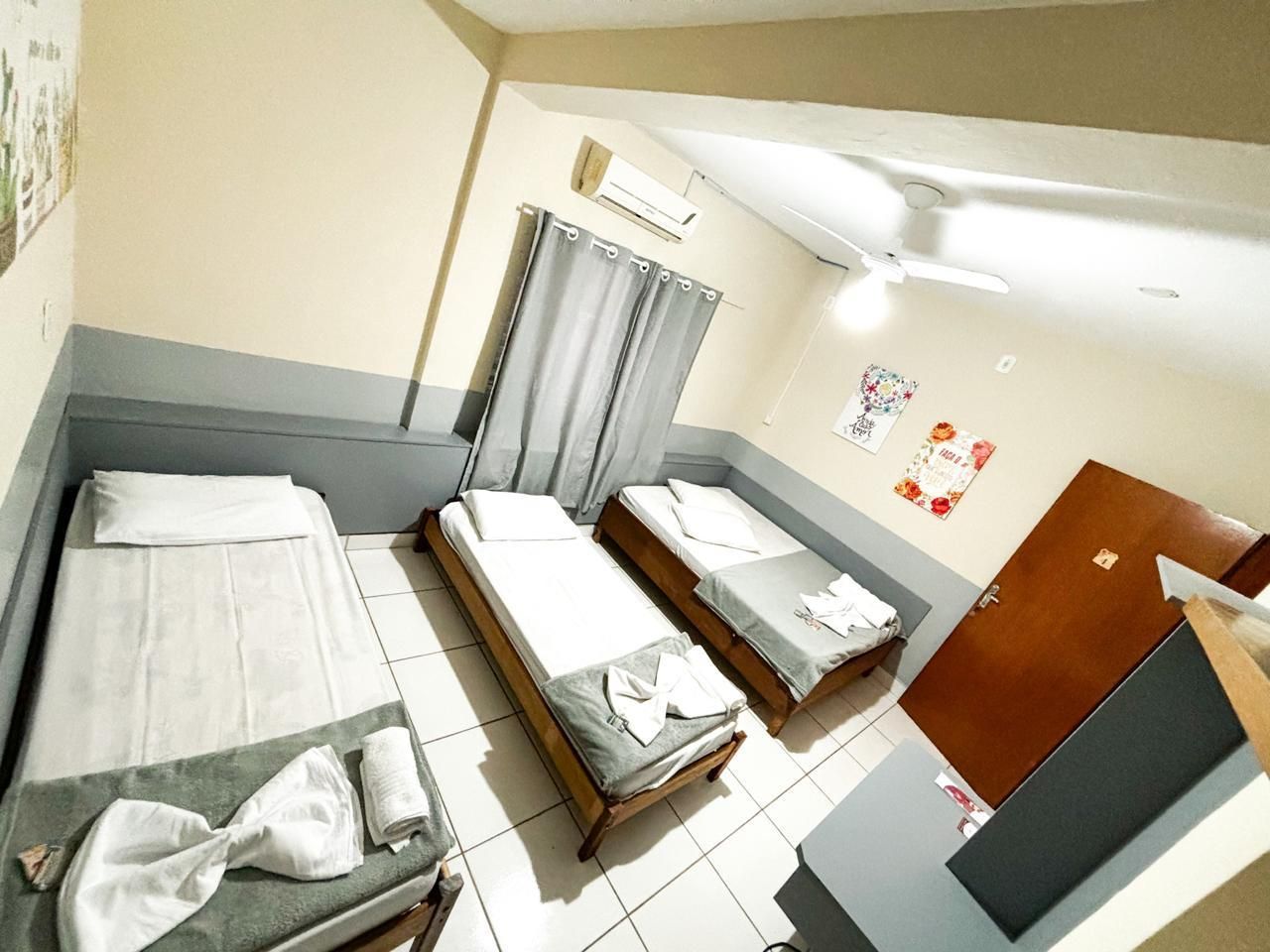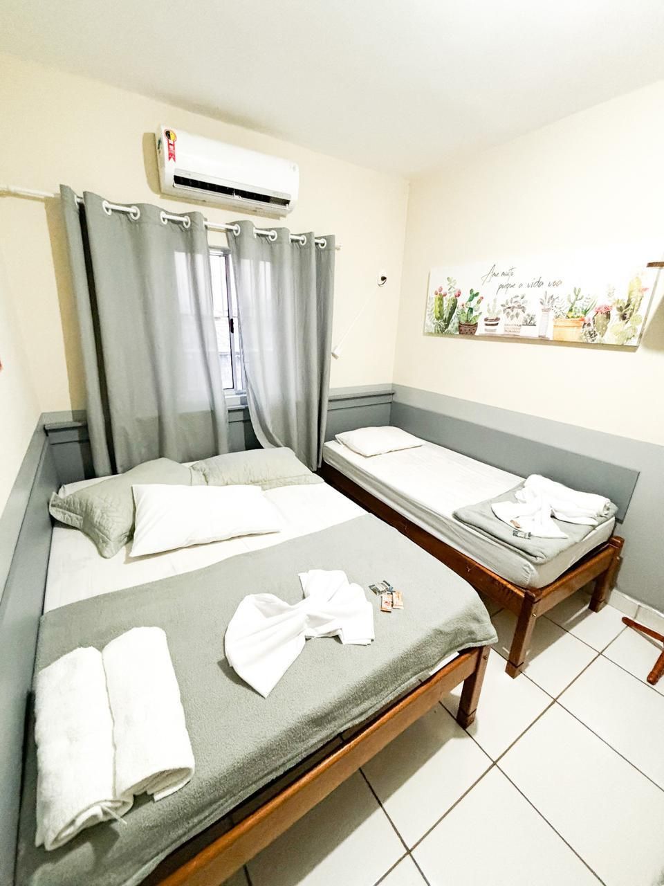O quarto triplo da Pousada Parada da Fé é ideal para famílias ou amigos que buscam conforto e praticidade. Com duas camas confortáveis, ar-condicionado, TV, frigobar e banheiro privativo, o ambiente é acolhedor e funcional. A decoração simples e charmosa garante uma estadia agradável, proporcionando momentos de descanso e tranquilidade em Aparecida, SP. Perfeito para quem deseja explorar a cidade com conforto e praticidade.