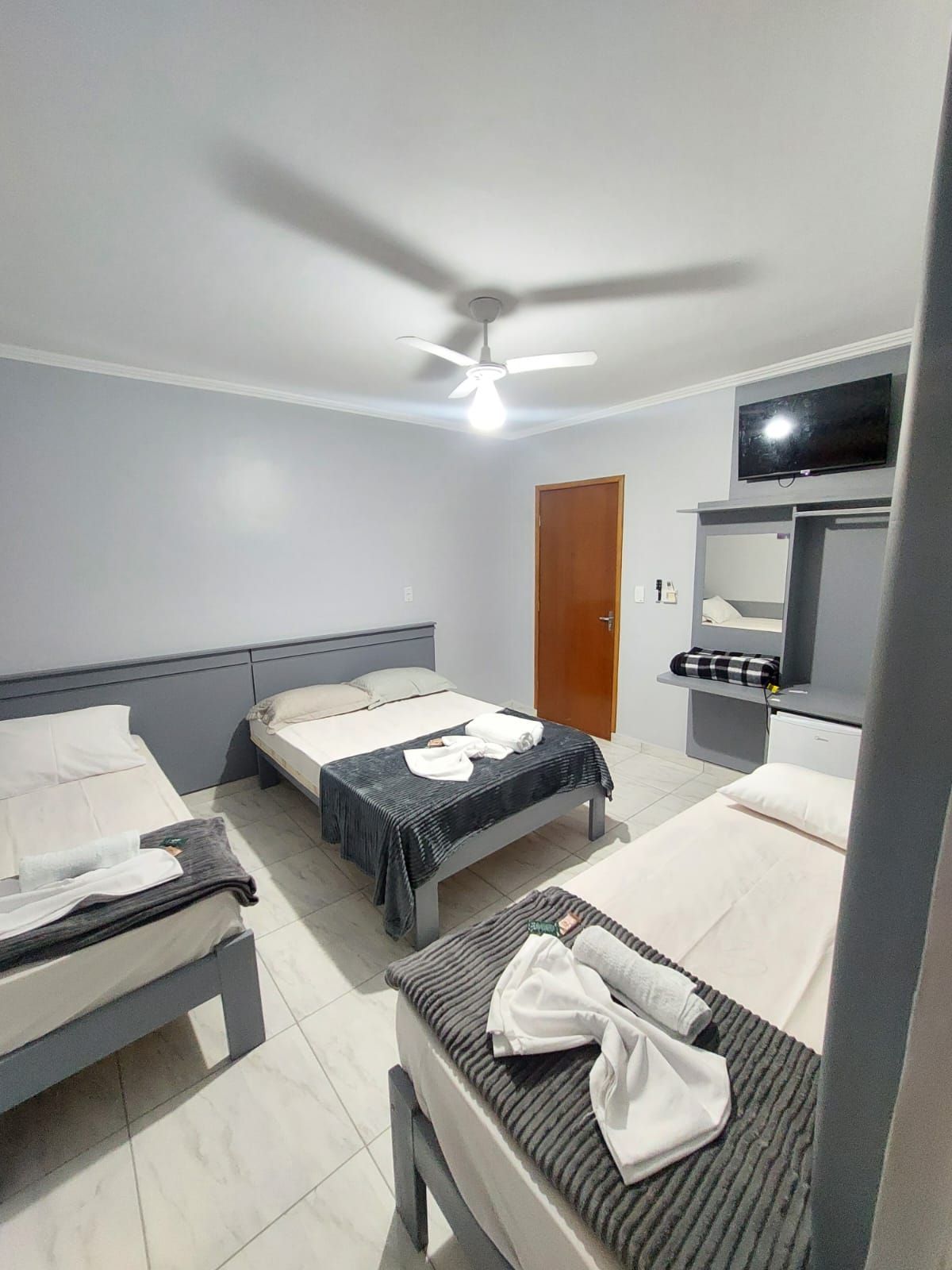 O quarto quádruplo da Pousada Parada da Fé é ideal para famílias ou grupos. Com capacidade para até quatro pessoas, o ambiente oferece camas confortáveis, ar-condicionado, TV, frigobar e banheiro privativo. A decoração aconchegante e funcional garante uma estadia tranquila, perfeita para descansar após um dia de passeios em Aparecida, SP, combinando conforto e praticidade para os hóspedes.